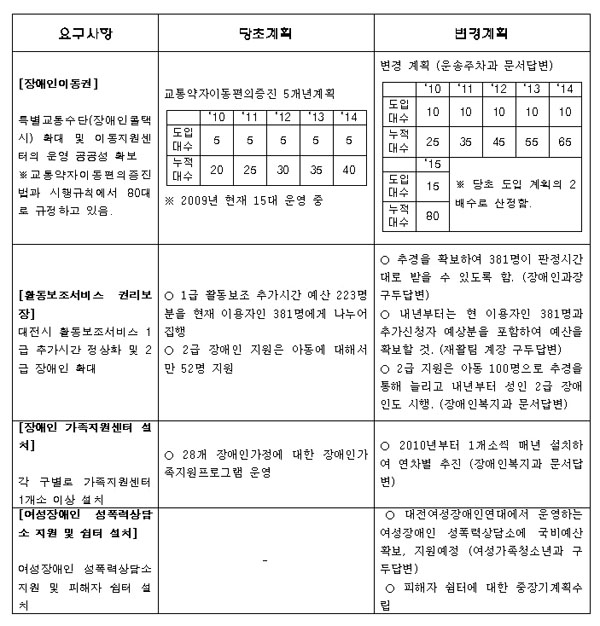 활동보조서비스의 경우는 추경을 통해 확보하기로 한 1급 장애인의 추가예산이 223명에서 381명으로 증가한 158명분의 확보와, 2010년 예산수립시에도 자연증가인원 계획을 수립한 예산계획수립이 전제가 되어야 할 것이며, 2급 장애인에 대한 예산계획도 2009년 추경을 통해 확보키로 한 장애아동에 대한 100명분의 예산과 2010년 본 예산에 장애성인 50명에 대한 예산수립이 이루어져야 할 것이다.