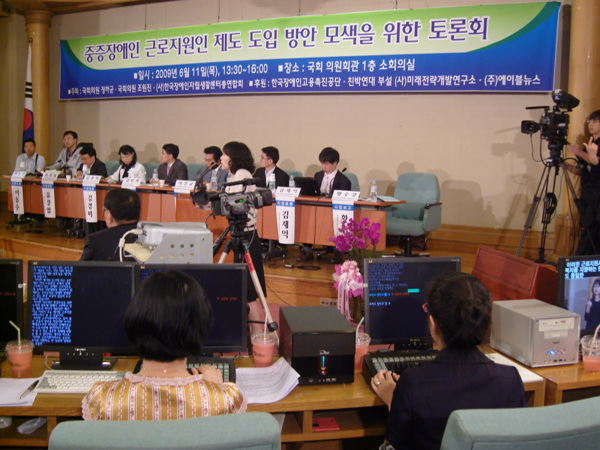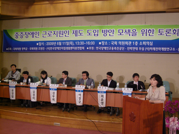 정하균 친박연대 의원과 조원진 한나라당 의원, (사)한국장애인자립생활센터총연합회가 공동 주최한 이번 토론회는 중증장애인의 노동권 보장을 위해 정부가 시범사업 중인 근로지원인서비스의 연구 및 시범사업 보고, 근로지원서비스 정책방향, 근로지원인서비스 제도화의 필요성, 이용자 입장에서 본 근로지원서비스 등에 대한 심도있는 논의와 토론이 이뤄졌다.
