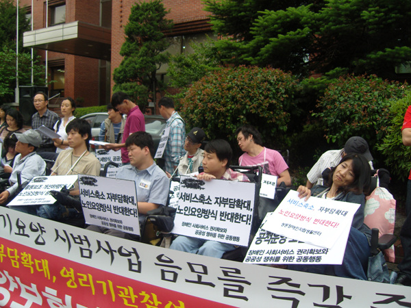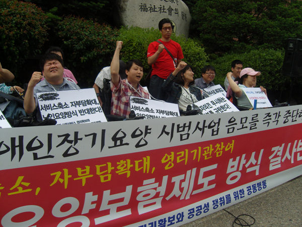 공동행동단은 이날 기자회견에서 “지난 2007년 4월, 노인장기요양보험법 제정 당시 장애인이 제외됨에 따라 이에 대한 대책으로 마련된 장애인장기요양제도의 시범사업이 애초의 활동보조사업을 확대하는 방식으로 장애인장기요양제도를 시행하는 것이 아니라 노인요양보험 방식으로 시범사업을 강행하려 한다.”고 거세게 문제를 제기했다.