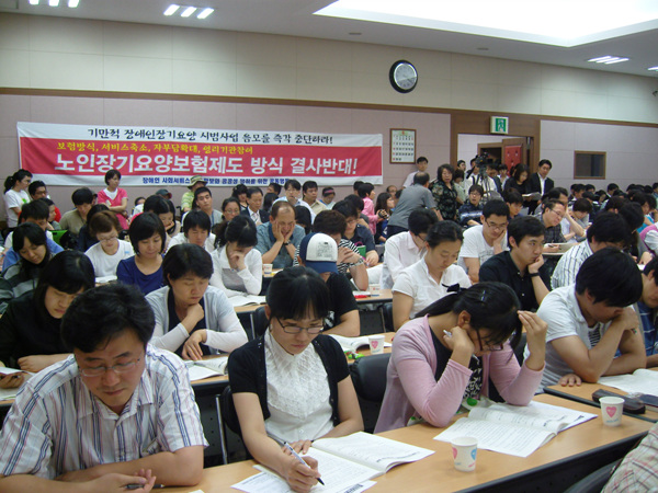이어 박지영 전국공공서비스노동조합 정책부장은 “7월 1일이면 노인장기요양제도가 시행 된지 만 1년이 되간다. 현재 노인장기요양제도 시행 교육기관과 사업 제공기관 난립으로 대상자에게 서비스가 제대로 제공되지 않고 있는 실정이다. 아직 노인장기요양제도가 시행 된지 1년도 안됐고, 수정․보완해야하는 문제투성이의 제도를 왜 장애인 정책의 근간으로 사용해야하는 지 의문.”이라고 표명했다.