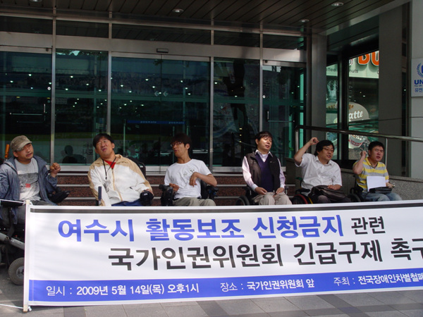 최용기 전국장애인차별철폐연대 공동대표는 “현재 여수시의 한 장애인이 여수시청을 대상으로 국가인권위원회에 진정서를 제출한 상태다. 이 장애인은 진정서를 제출한 후 여수시청으로부터 활동보조인서비스를 파견해 주겠다는 약속을 받아냈지만 대기자로 기다리고 있는 여타 장애인들에 대한 활동보조인서비스 지원은 이뤄지지 않고 있다.”고 밝혔다.
