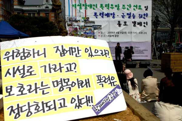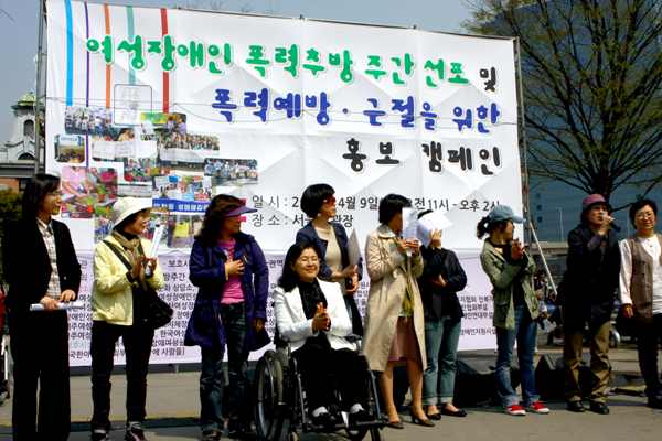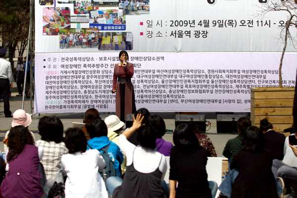 전국성폭력상담소, 보호시설협의회 소속 상담소 16개소, 성폭력피해 여성장애인 보호시설 등 전국 폭력피해 여성장애인을 지원하는 활동단체들은 지난 9일 서울역 광장에서 ‘여성장애인 폭력추방 주간 선포 및 폭력예방 근절을 위한 홍보캠페인’을 갖고 여성장애인들에게 가해지는 차별과 폭력의 문제를 알렸다.