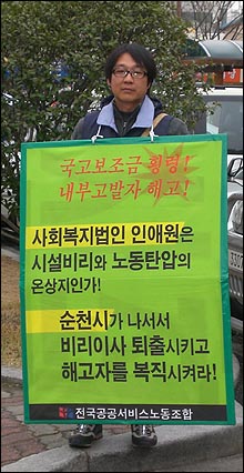 | 인애원 해고노동자 안용호씨는 "문제가 해결될 때까지 1인 시위를 계속하겠다"고 말했다. ⓒ민주노총공공서비스노조 광주전남지부 제공 | ||