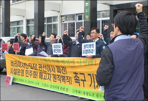 | 민주노총공공서비스노조 광주전남지부는 지난 18일 순천시청 앞에서 기자회견을 열고 '비리이사 퇴진과 관선이사 파견, 시설운영민주화, 해고자 원직복직'을 촉구했다. ⓒ민주노총 공공서비스노조 광주전남지부 제공 | ||