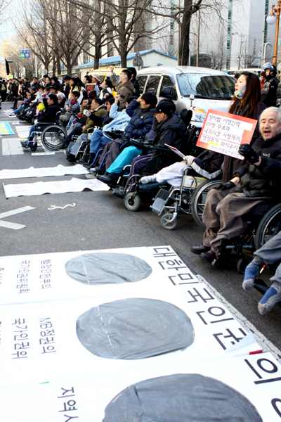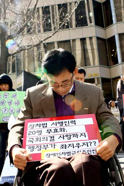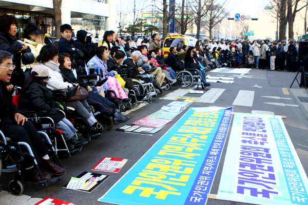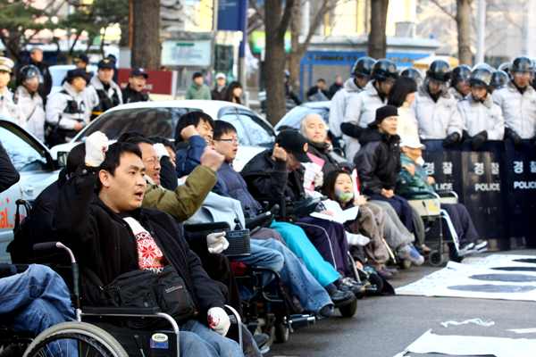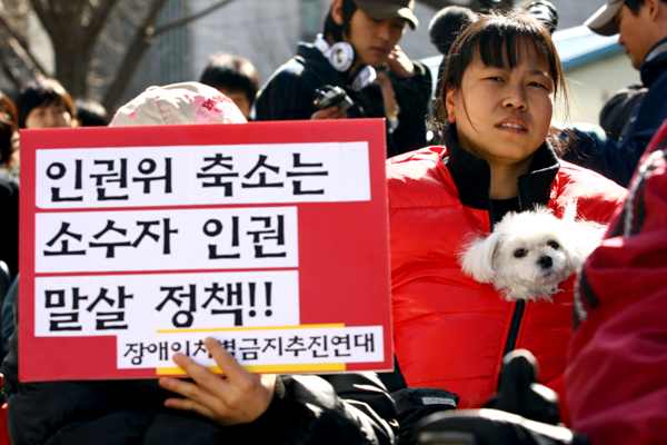 이 자리에서 박경석 집행위원장은 “장애인들의 피와 땀으로 만들어낸 장차법이 시행됨으로써 장애인들의 인권위 진정은 날로 늘어가고 있는데 인권위를 축소하겠다는 행안부 발표는 장애인은 물론 소수자 인권의 눈을 가리겠다는 것과 다름없다.”며 “인권위 축소를 놓고 장애계가 강하게 반발하자 행안부 관계자는 ‘장애인과 관련한 인원은 축소하지 않겠다’고 말했으나 인권위 축소는 장애인만의 문제가 아닌 소수자 모두의 인권과 관련된 것이기에 축소방침은 즉각 철회해야 한다.”고 주장했다.