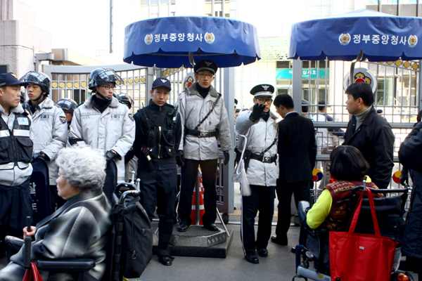 | 집회도중 휠체어를 타고있는 장애여성 둘이 청사 화장실을 이용하게 해달라고 했으나 이를 막아서고 있는 경찰. ⓒ전진호 기자 | ||