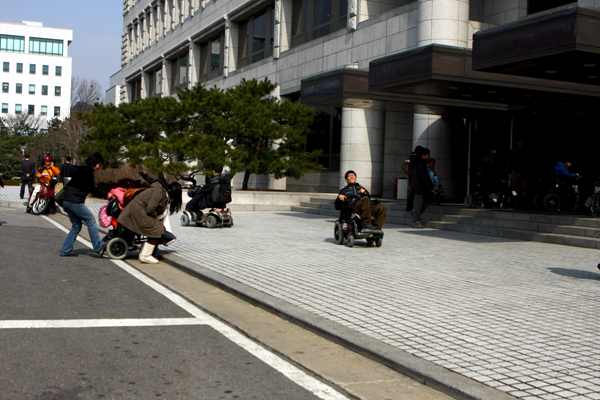 기자회견에 참석한 장애인들이 대법원 식당을 찾았다.