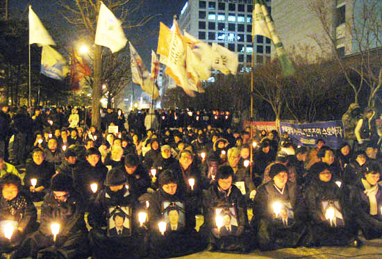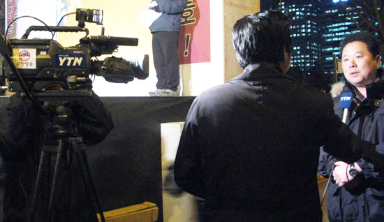 | 25일 저녁 7시30분부터 서울 여의도 산업은행 옆에서 언론노조 주최 촛불문화제가 열리고 있다. /미디어스 | ||