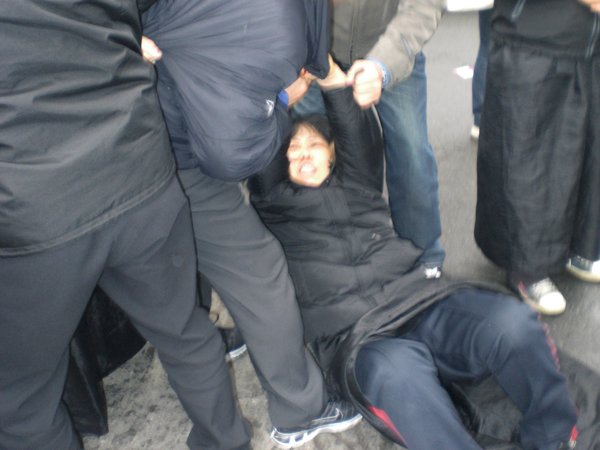 | 경찰이 고 윤용헌 씨 부인 유영숙 씨를 잡아끌고 있다. 사진/ 제보 | ||