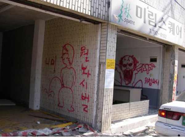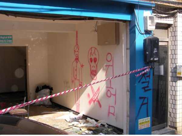 | 용역들이 그린 것으로 보이는 스프레이 그림. 주민의 증언에 따르면 실제 그림과 같은 말을 하고 다닌 것으로 확인됐다. | ||