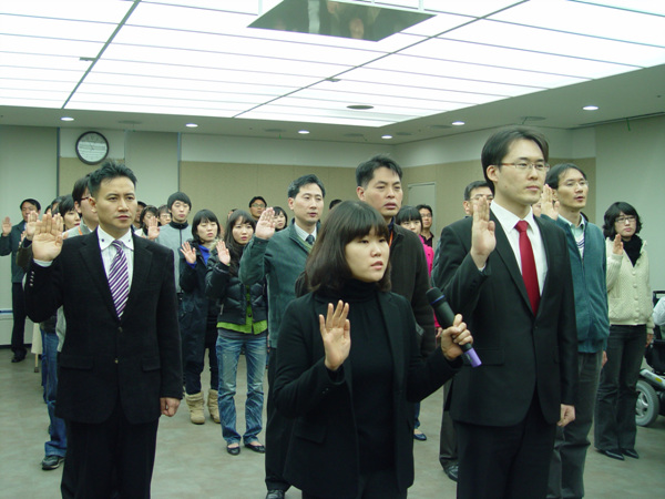 | ▲ 한국장애인개발원 직원들이 고객서비스헌장을 제창하는 모습. ⓒ윤미선 기자 | ||