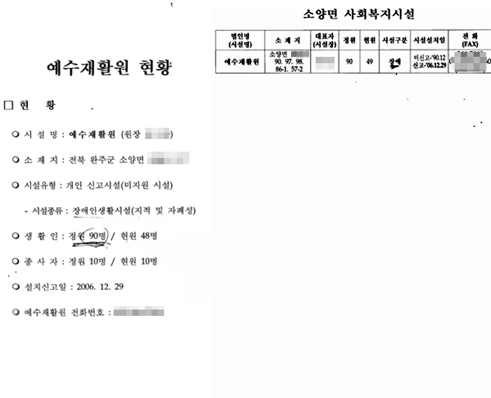 예수재활원의 관리감독 책임이 있는 완주군청과 소양면사무소에서 제시한 예수재활원 현황표, 왼쪽은 완주군청에서 내놓은 예수재활원 현황표이고 오른쪽은 소양면사무소에서 제공한 현황표다. 부실하기 짝이 없는 이 내용만 보더라도 군청과 면사무소의 인원이 다른 등 관리 감독이 전혀 이뤄지지 않고 있는 상황을 여실히 볼 수 있다. ⓒ전진호 기자