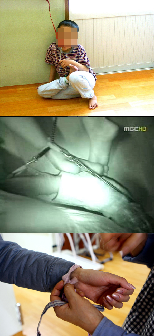 | (위에서부터) 예수재활원에 자원봉사 온 이가 찍은 걸로 추정된 사진. 인터넷 검색을 통해 쉽게 확인할 수 있다. 두 번째 사진은 전주 MBC가 취재한 ‘강박’ 장면이고, 마지막 사진은 예수재활원 측에서 자폐성 장애가 있는 아이들을 일시적으로 묶을 때 사용한 끈아라며 묶는 모습을 시연해 보이고 있다. | ||