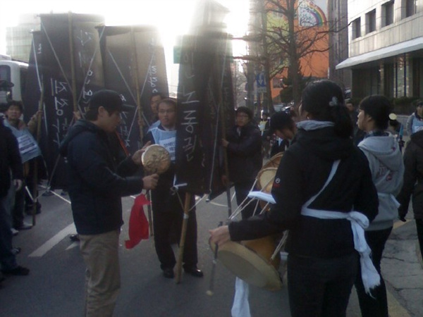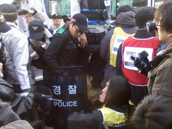 <4 보> 아현중학교 앞에서 장애인인권행진단 경찰과 몸싸움, 경찰 측 7시까지 해산 종용