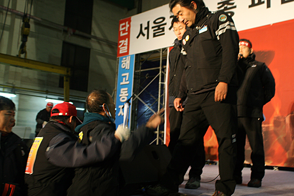 | 잠정합의안 내용에 격분한 한 조합원이 단상 위의 황정우 위원장에게 거세게 항의하고 있다./ 이정원 기자 | ||