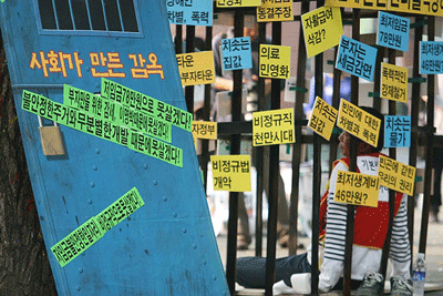 소수의 가진 자들에게만 부가 집중되는 상황에서 경제위기는 계속되고 대다수 민중이 빈곤의 나락으로 빠져드는 상황임에도 이명박 정부는 의료민영화와 사회복지 예산 삭감, 저임금 비정규직 일자리를 만들며 빈곤층과 특정 집단 계층에 대한 선별적인 복지지원을 강화하려한다. 한국 뿐 아니라 전 세계가 빈곤의 띠 안에서 헤어 나오지 못하고 있는 지금, 민중복지와 삶의 개선을 위한 노력은 하지 못할 망전 이명박은 민중들의 삶을 뼛속까지 차별과 빈곤으로 몰아가고 있다.
