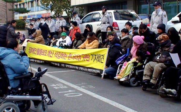 지난 17일부터 서울 여의도 이룸센터 앞에서 천막농성에 들어간 장애인활동보조예산, 장애인노동권, 장애인 연금 쟁취 공동행동(이하 공동행동)은 한나라당 당사 앞에서 ‘장애인활동보조예산 삭감하는 한나라당 규탄’기자회견을 개최했다.