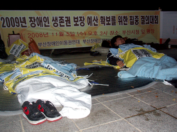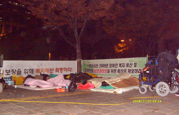 부산장애인이동권연대와 부산장애인자립생활센터협의회(준) 소속 회원 20여명은 지난 5일부터 부산시청 앞 광장에서 장애인생존권 보장 예산 확보를 위한 노숙투쟁을 벌이고 있다.