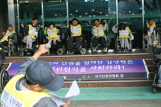 게다가 장애, 인권활동가들이 김 씨에겐 인권위원 자격이 없다고 사퇴를 촉구하는 기자회견을 하려는데 인권위는 건물을 걸어 잠그고 경찰에 시설보호 요청씩이나 했다고 합니다. 공권력의 과도한 사용을 감시해야할 인권위가 장애, 인권 활동가들이 못 올라오도록 과도하게 공권력을 동원한 것이지요.