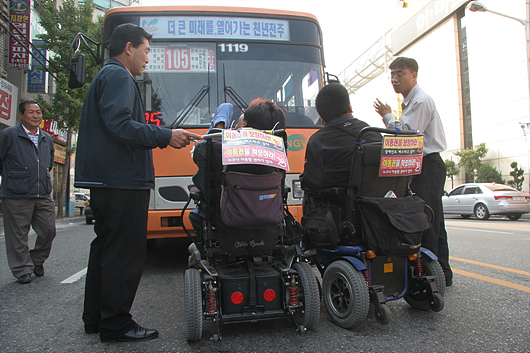 전북지역 교통약자의 이동권 확보를 위한 공동대책위원회는 15일 낮 2시부터 이마트, 남부시장, 모래내 시장 등 전주시내 주요 시내버스 정류장에서 장애인 2-5명이 버스를 타는 투쟁을 벌였다. 이들은 목적지에 버스가 가는지 묻고 버스에 타려하자 휠체어를 태울 수 있는 시설이 없다며 버스를 타려는 장애인을 피해 지나갔다.