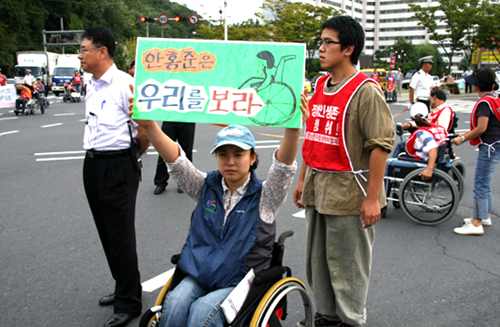 전국장애인차별철폐연대(이하 전장연)’와 ‘한국장애인자립생활센터협의회’가 25일 마산시 삼각공원에서 집회를 가지고 한나라당과 안홍준 의원을 규탄했다.