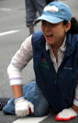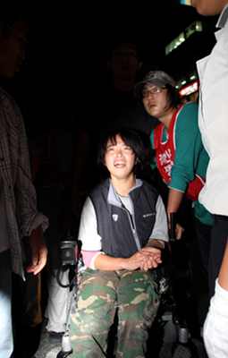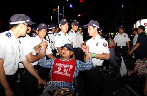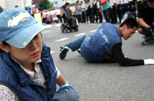 신체의 일부와 같은 휠체어에서 내린 중증장애인들은 아스팔트위에서 두 팔로 몸을 끌어당기며 힘겨운 행진을 시작했다. 시간이 흐르면서 몸은 땀으로 뒤덮이고 있었고, 여기저기에서 힘에 겨운 비명이 터져 나왔다. 그 속에서 끝내 힘에 겨웠던 여성장애인은 울음을 터뜨렸다.