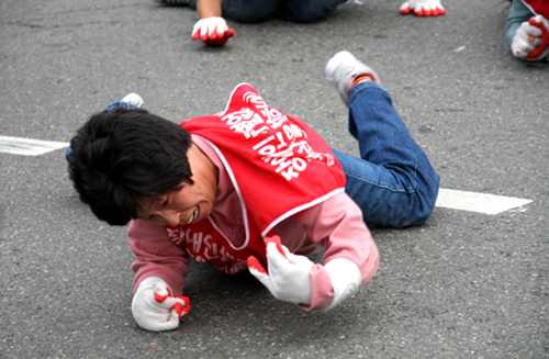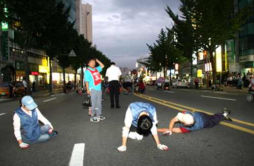 몸을 비틀며 행진을 하던 장애인들에게 한계가 오기 시작했다. 그러나 행진은 계속 이어졌다. 몸을 비틀고 뒹굴면서 무려 두어 시간 남짓 행진을 힘겹게 이어가는 동안에 해는 떨어졌다. 그사이 퇴근길 인도에는 많은 시민들이 그들을 안타깝게 지켜보았다.