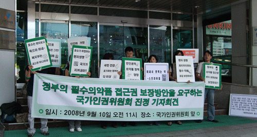 2008년 9월 10일 정부의 필수의약품접근권 보장 방안을 요구하는 국가인권위원회 진정이 있었다. “한국의 의약품 제도는 초국적 제약회사들을 비롯한 기업들의 이윤동기에 끌려다니기 쉬운 상태여서 환자들의 건강권을 보장하지 못하고 있기 때문에” 정부의 포괄적인 의약품접근권 보장 방안을 요구한 것이다.