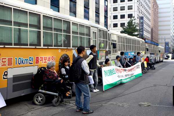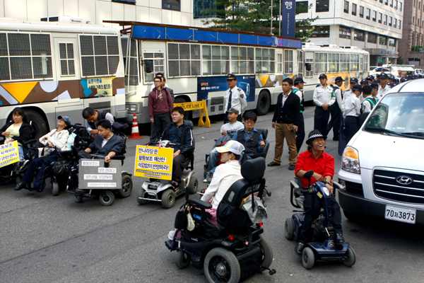 이에 대해 전장연 등은 “우리가 기자회견을 하려는 곳은 한나라당 당사 앞인데 전경버스로 막아 도로로 쫓겨났다. 차들이 지나다녀 위험한 상황임에도 불구하고 경찰이 이를 방치하자 우리가 안전을 위해 막은 것.”이라며 “전경버스부터 치워라. 그러면 우리도 도로가 아닌 곳에서 기자회견을 마치겠다.”고 격렬히 항의하자 우려했던 물리적인 마찰은 빚어지지 않았다.