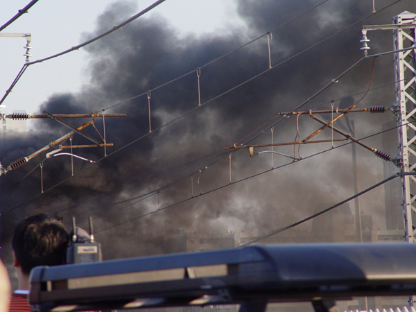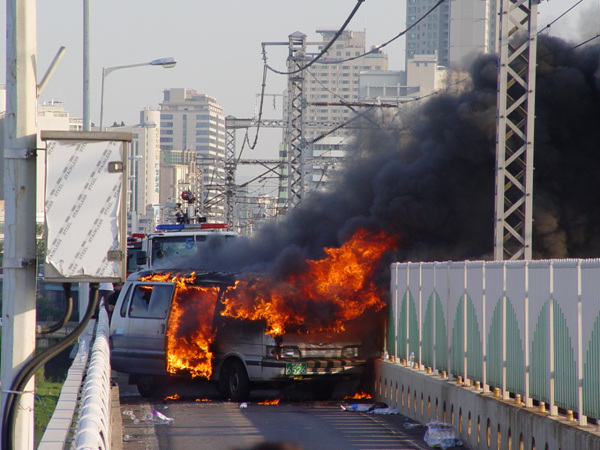 | ▲ 전경과 대치중이던 최전방의 봉고차량이 검은연기를 내며 불에 타고 있다. ⓒ윤미선기자 | ||