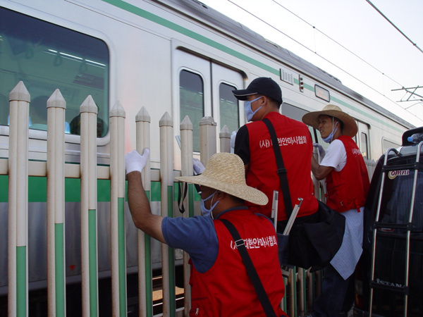 | ▲ 지하철 선로위로 시각장애인 안마사들이 진입 중이다. ⓒ윤미선기자 | ||