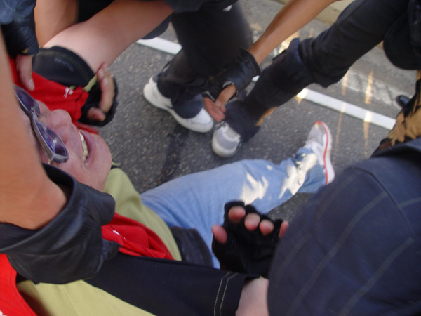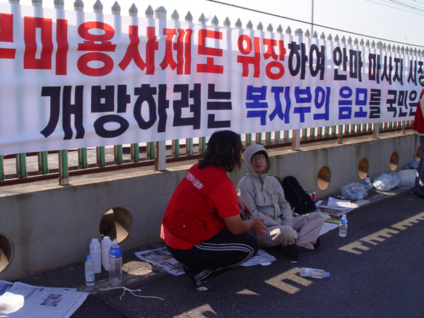 | ▲ 전경들에 의해 시각장애인 안마사들이 연행되고 있다. ⓒ윤미선기자 | ||