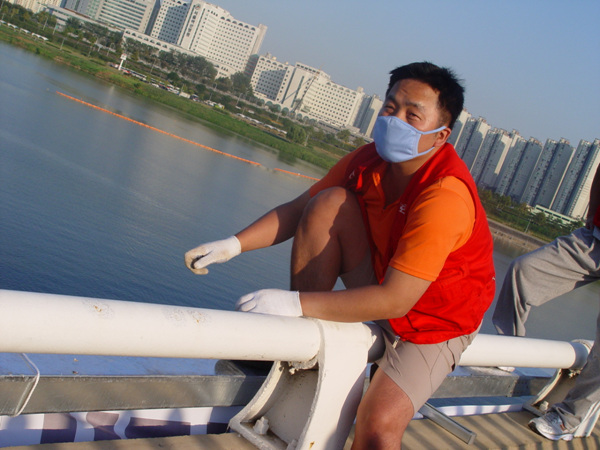 | ▲ 5시가 가까워지자 전운이 감도는 가운데 한 시각장애인 안마사가 다리위에서 운동화끈을 질끈 동여매고 있다. ⓒ윤미선기자 | ||
