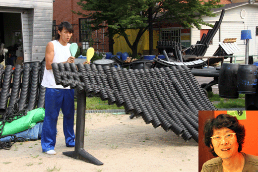 | 폐자원을 모아 자르고 다듬어 만들어진 악기는 독특한 소리로 어우러져 다시 사람들에게 감동을 준다. 청소년의 다양한 활동을 보장하기 위해 만들어진 노리단은 이제 세대를 뛰어넘어 국내 뿐 아니라 국외까지 초청되어 공연하고 있다. 네모 안 사진은 예술감독 안석희씨. | ||