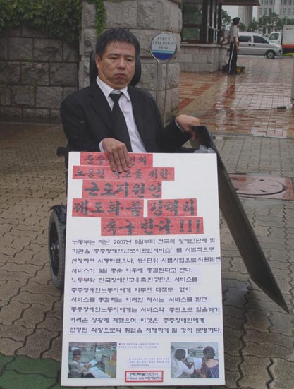 근로지원인제도 법제화 1인 시위의 선두에 선 김재익 굿잡장애인자립생활 소장은 “중증장애인이 사회구성원으로 일터에서 사회적 역할을 원활히 수행할 수 있도록 도와주는 근로지원인 제도의 법제화를 위해 우리는 1인 시위 뿐 아니라 단식·삭발 투쟁까지 불사하겠다”고 선언했다.