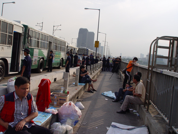 | ▲ 동료 2명이 투신한 후에도 마포대교 다리 밑과 위를 지키며 고공시위를 벌이고 있는 시각장애인 안마사들 ⓒ윤미선 기자 | ||