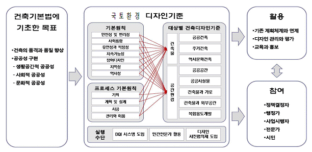또한 국토해양부는 민간전문가 활용, 효율적 발주방식 등의 실행지침으로 각종 건축물과 공간 환경에 적용될 바람직한 조성기법과 국내외 우수사례로 마련할 방침이다.