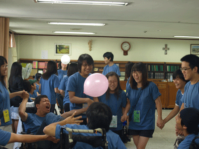 그런데 처음 요청과는 달리 아예 보이지 않는 시각 장애를 가진 꿈틀이는 없어서 시각 장애를 고려하지 않고 교육을 진행했다. 먼저 10여 명씩 동그랗게 서서 옆 사람 손을 잡고 그 상태에서 풍선을 바닥에 떨어뜨리지 않고 띄우는 놀이를 했다.