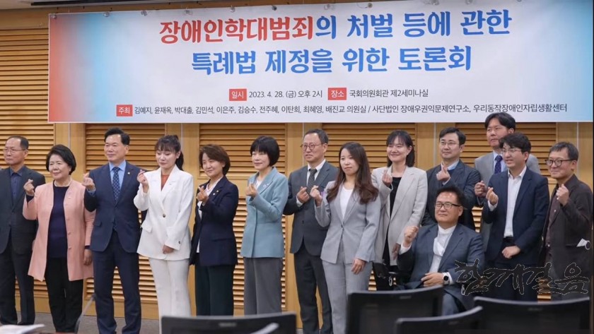 지난 2023년 4월 20일 국민의힘 김예지 의원 대표발의로 장애인학대범죄의 처벌 등에 관한 특례법 제정안이 발의되었다. 여·야가 합심하여 51명의 의원이 공동 발의한 이 법안은 장애인 학대범죄를 구체적으로 정의해 처벌의 실효성을 높이고 수사와 재판 절차상의 지원을 강화하여 법무부가 장애인의 사법접근권을 보장하는 것을 목적으로 한다.