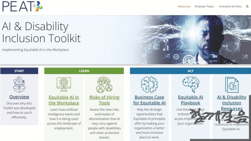 ▲ PEAT(고용 및 접근성 기술 파트너십)에서 소개하는 인공지능 & 장애 통합 툴킷 정보(고용환경에서의 공정한 AI, 자동화 채용도구의 위험성, 공정한 AI를 사용한 기업 사례, 인공지능 플레이북 등) ⓒPEAT 홈페이지
