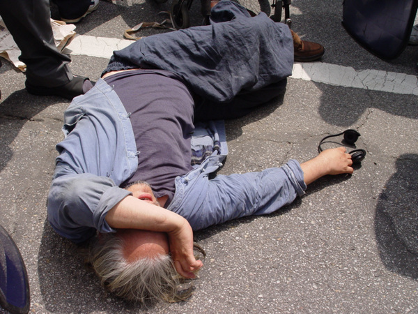 | ▲ 박경석 전장연 집행위원장이 뇌졸중, 일사병을 호소하며 휠체어에서 쓰러져 바닥으로 떨어졌다.ⓒ윤미선기자 | ||