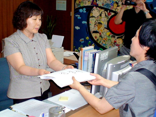 | ▲ 한국시각장애인여성연합회 전인옥 상임이사가 진정서를 인권위에 접수시키고 있다 ⓒ전진호 기자 | ||