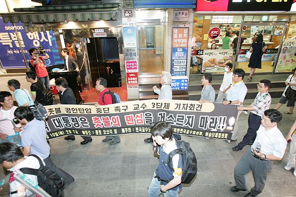 이명박 정부의 일방통행에 시민들의 촛불집회가 계속되고 있는 가운데 오늘(10일)도 서울 종로 보신각 앞에서는 촛불집회가 열렸다. 오늘 촛불집회는 교수노조, 민교협, 학술단체협의회 등 교수 3개 단체와 문화예술계, 보건의료인들이 주최해 열렸다.