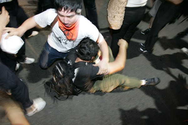 | 경찰이 도로행진에 나서는 시민을 막는 과정에서 한 시민이 넘어졌다. | ||