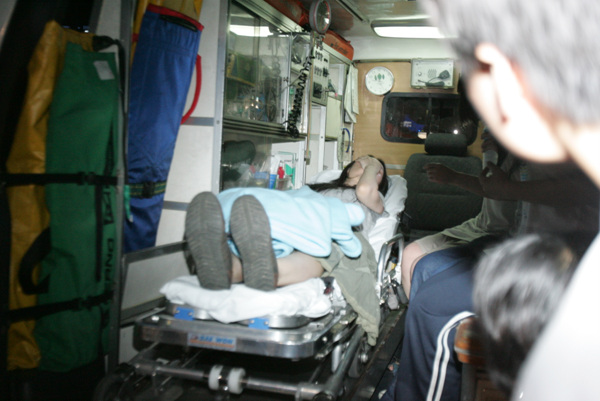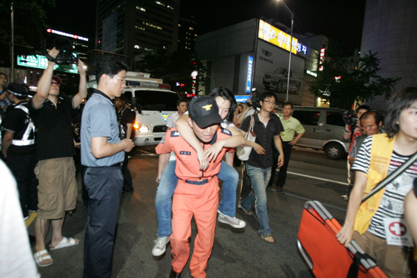 | 구급대원에 엎혀 구급차로 후송되는 시민 | ||
