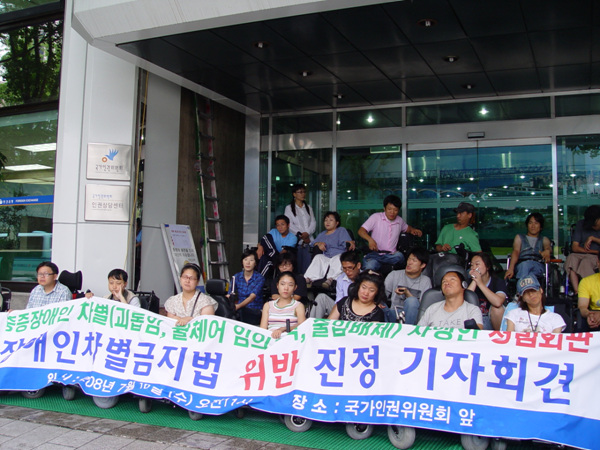 | ▲ 정립회관 민주화를 위한 공동대책위원회는 지난 16일 국가인권위원회 앞에서‘중증장애인 차별 자행한 정립회관 「장애인차별금지법」 위반 진정 기자회견’을 개최했다.ⓒ윤미선기자 | ||