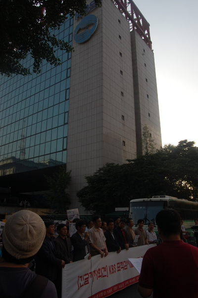| 6월 13일 KBS 신관 정문 앞에서 가진 표적감사 비판 기자회견. 이날 밤 시청 광장에서 촛불시위를 하던 시민 5천여 명은 마포대교를 건너 KBS 앞으로 모였다. | ||