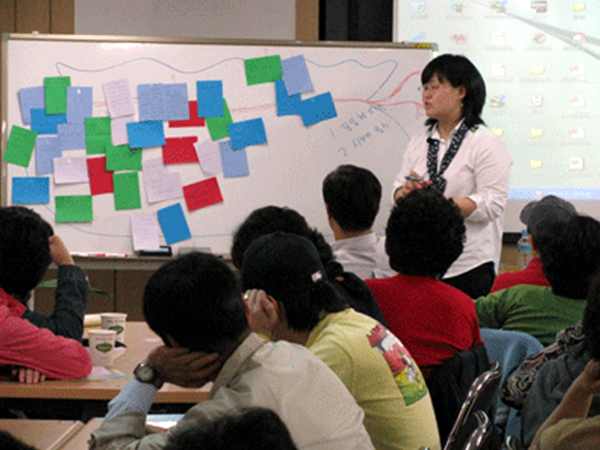 참여한 꿈틀이에게 쪽지를 한 장씩 나눠준다. 그리고 ‘장애인 하면 떠오르는 말’을 적도록 한다. 장애인에 대해 사람들이 흔히 가지고 있는 편견이라고 생각되는 낱말을 카드에 적은 다음, 모두 불 수 있도록 칠판과 같은 곳에 붙인다.