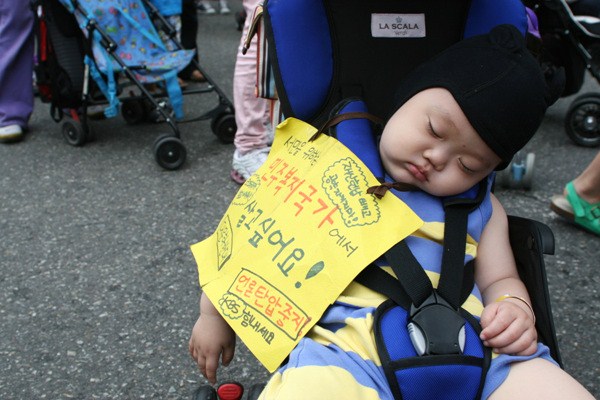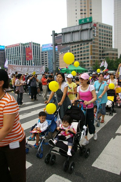 '유모차부대'로 활약한 한 주부도 무대에 올랐다. 충남 온양에서 아이 셋을 데리고 온 40대의 이 주부는 "돼지나 닭의 사료로도 쓰지 않는 것을 수입하는 이명박 대통령에게 이건 잘못된 것이라고 얘기하고 싶었고, 우리 엄마들이 아이의 건강을 지키기 위해서 나온 거다"라며 "오늘 살수차에 목욕할 것이다, 진실은 반드시 이기며 어둠은 촛불에 의해 사라진다"고 말했다.