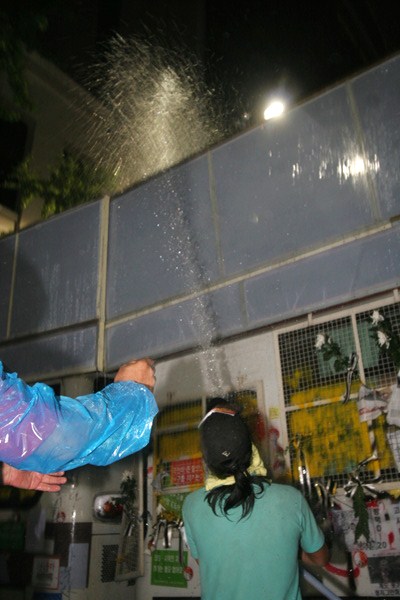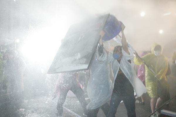 | 시민들도 소방호스를 소화전에 연결해 물대포에 맞섰다. | ||